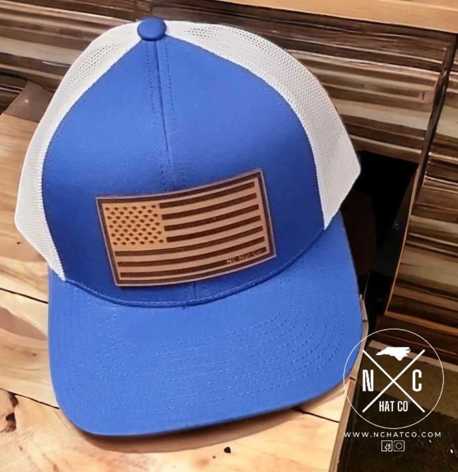 Want a different color? Click below to go to our website! | Pacific 104 Trucker | Genuine Leather Patch | Patches handmade to order so color pattern may differ slightly | Available in 61 colors & 22 Styles of Camo